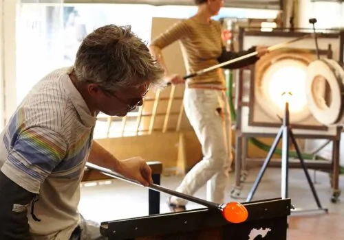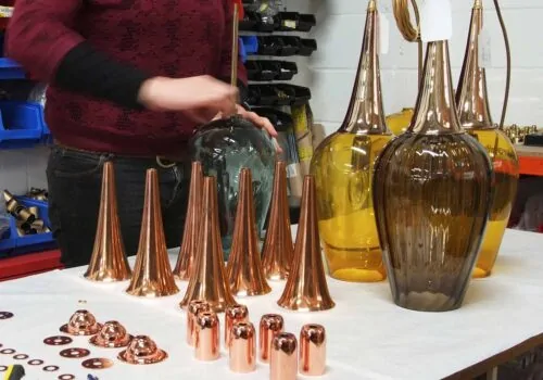 Rothschild & Bickers, provided us with the images below which show the furnaces and wooded tools which were originally designed and used in 50BC – the glass is blown using classical skills and craftsmanship and each piece is then carefully annealed and then moved into the cold workshop to be ground and polished, ready for the correct fitting to be attached.