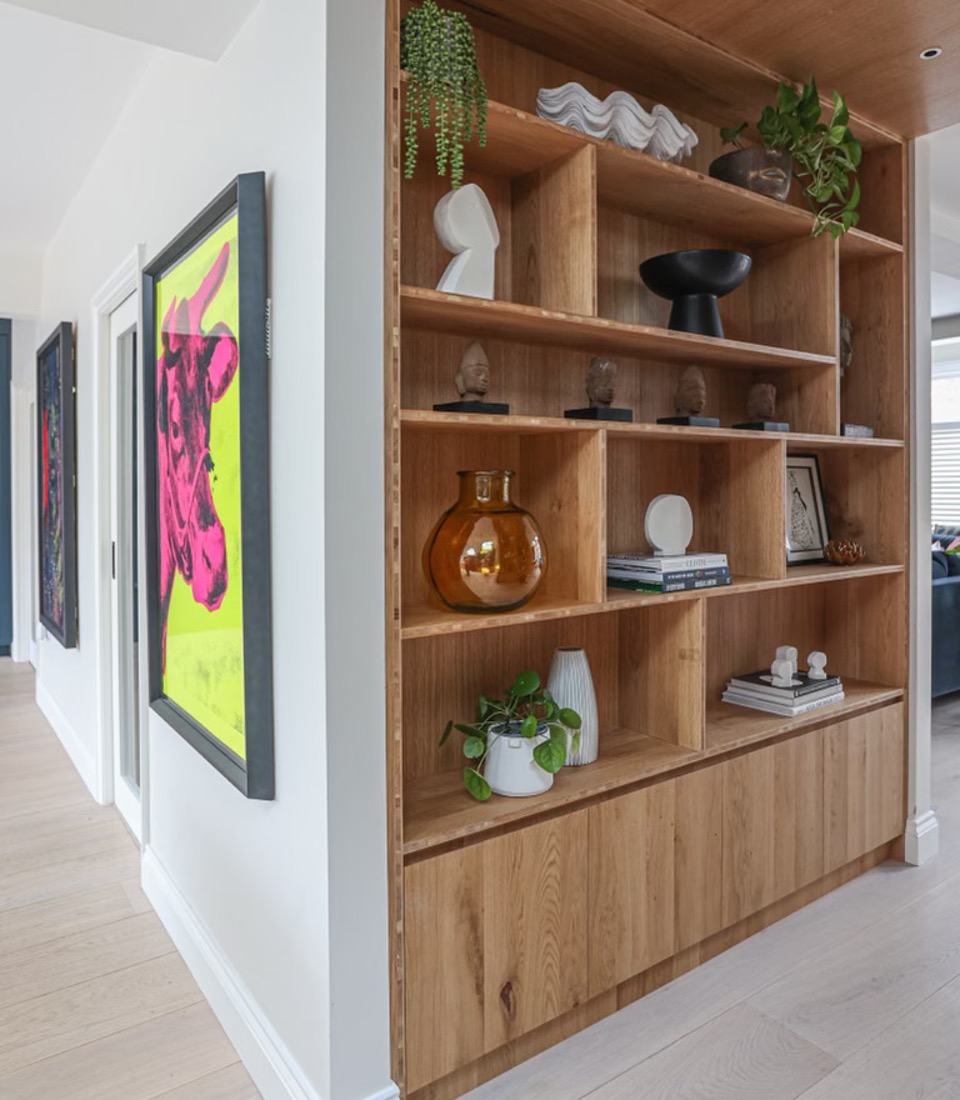 Our clients already had an impressive collection of artwork and accessories, all of which were considered throughout the interior architecture plan and design process and integrated into the overall design ethos for the house. The walk-through oak bookcase ‘tunnel’ was designed with storage of decorative books and accessories in mind and handmade by our joiner – creating a real sense of arrival and anticipation as one travels through towards the extension at the back of this Victorian house.