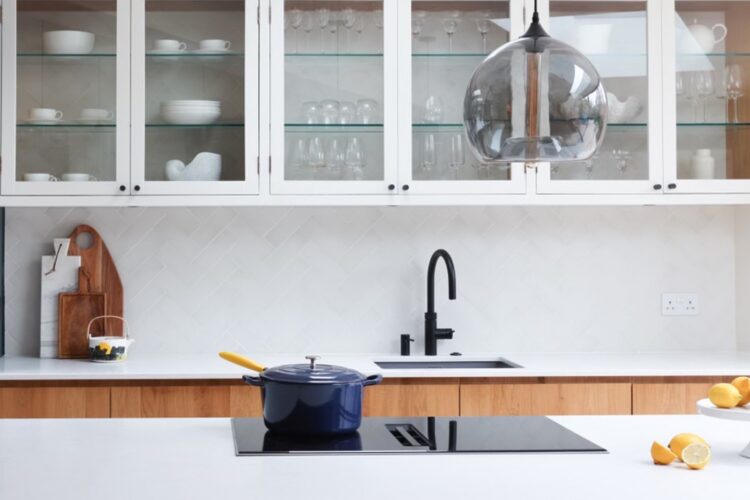The traditional walk-in larder was given a contemporary touch by the use of decorative tiling throughout, and the timber island/breakfast bar features a bespoke banquette seating area, to allow all the family to casually enjoy mealtimes together. Made by hand, this kitchen is truly bespoke to the space, and heavy on detail. The wall-hung cabinets are situated in front of the herringbone tiled splash back, creating a statement backdrop to the clients’ collection of crockery and glassware.