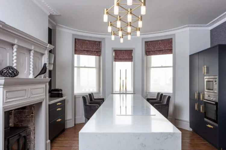 Pfeiffer Design was appointed to create the interior finishes and furnishings for the kitchen and entrance hall of this landmark Grade II Listed seafront property in Brighton. A beautiful Regency town house, the property gave us plenty of period architectural features to work with. We complemented them by juxtaposing and incorporating contemporary ideas, textures and colours to create coherent spaces, with the design flowing effortlessly from room to room. Our in-house team made and installed all the curtains, blinds and upholstered furniture pieces, while our local partners installed everything else from cabinets to lighting.